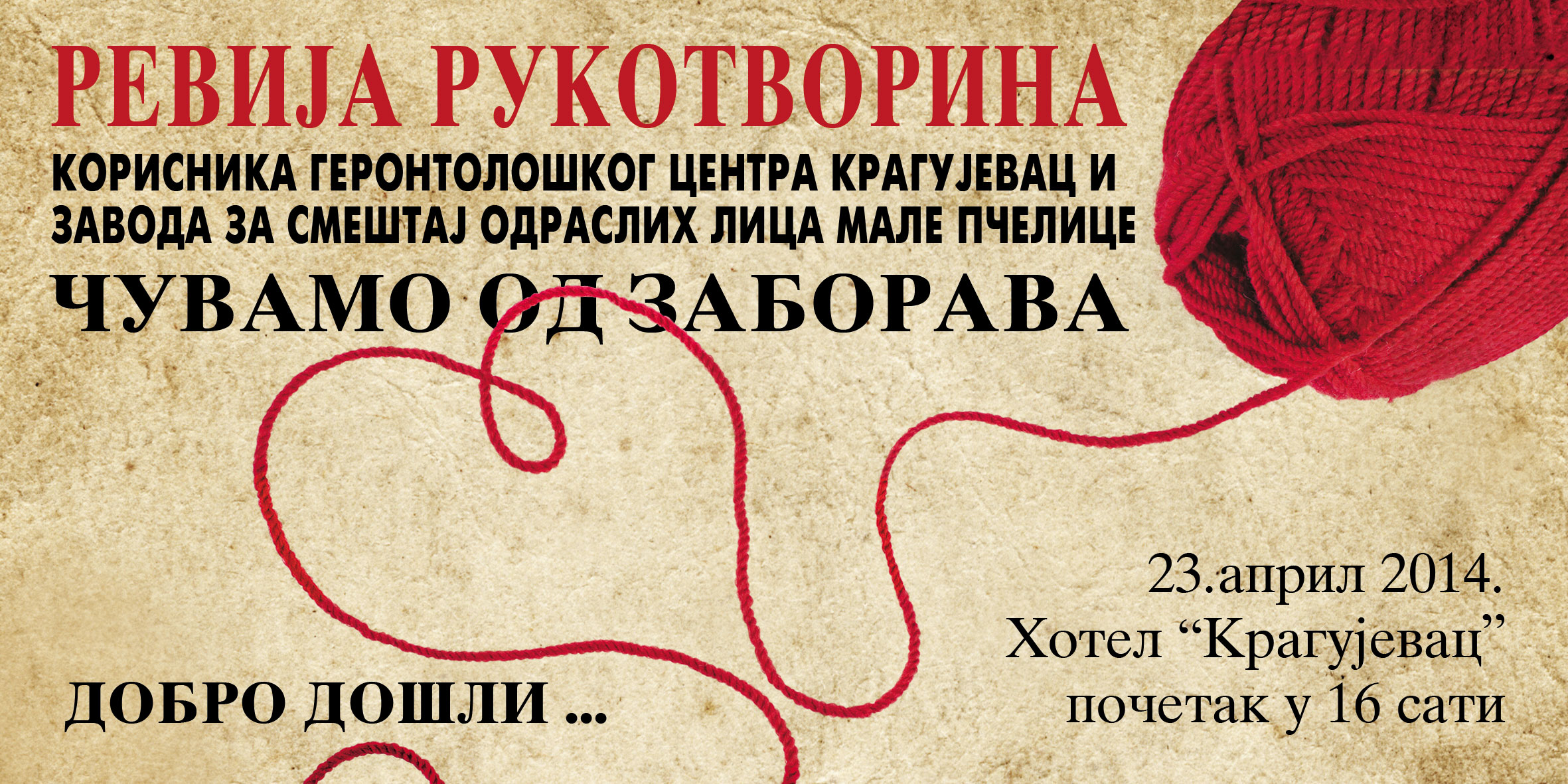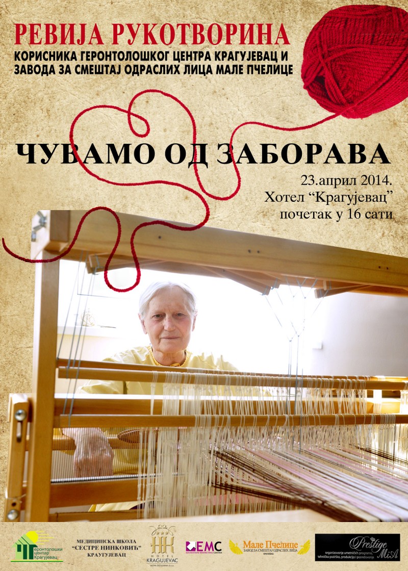 U Svečanoj sali hotela Kragujevac , 23. aprila 2014. održana je izložba rukotvorina pod nazivom „Čuvajmo od zaborava“, na kojoj su  izloženi radovi korisnika Gerontološkog centra Kragujevac i Zavoda za smeštaj i zbrinjavanje odraslih lica „Male pčelice“.