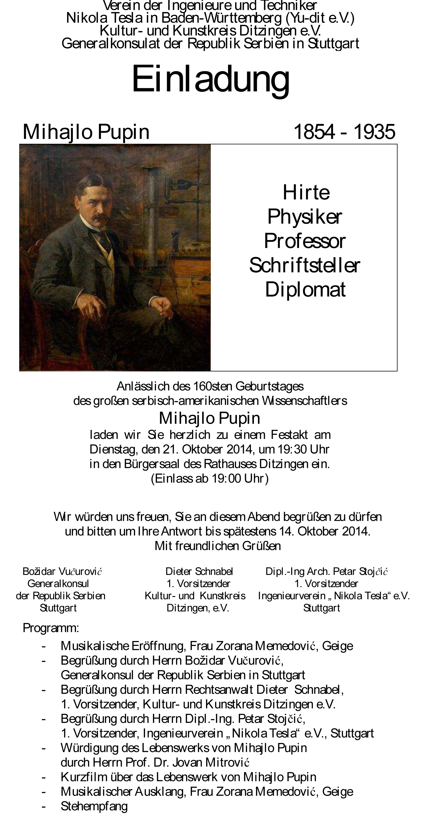 U Ditzingen-u (pored Stuttgart-a) održana je Akademija o Pupinu, koja je prvi put odrzana 2010-te. Predavanje o Pupinu je odrzao prof.dr.-Ing. J.Mitrovic iz Stuttgart-a. Tom prilikom je prikazan i film o Pupinu preveden na nemački.